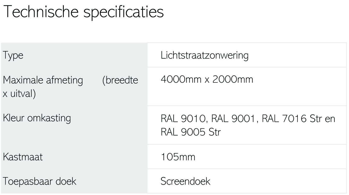 De SolidSky is in verschillende RAL-kleuren standaard leverbaar. Overige RAL-kleuren zijn op aanvraag mogelijk. Standaard geleverd met ritsgeleid 1% glasvezeldoek.