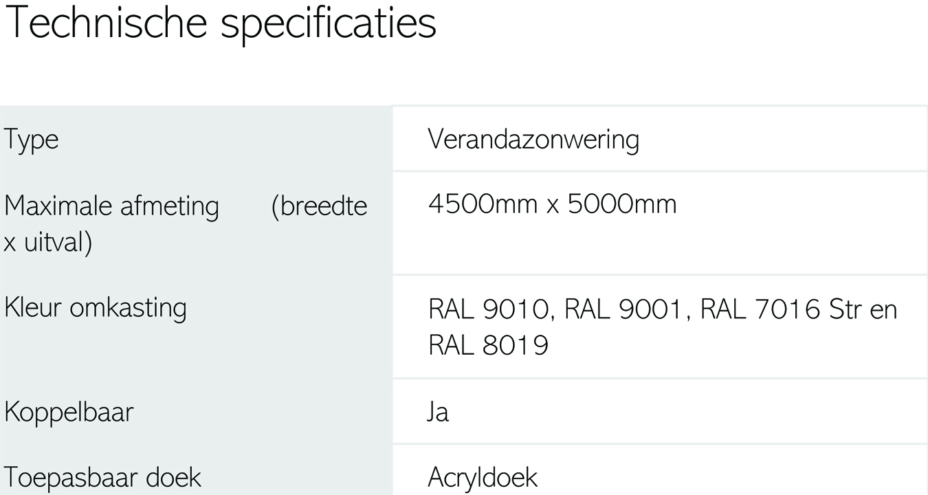 De Summerlight is reeds jaren een succesvolle verandazonwering. Via de geleiders glijdt het doek over de bovenzijde van het dak van de veranda of serre, zodat hinderlijk zonlicht geweerd wordt. De unieke veerconstructie van de Summerlight houdt het doek op spanning. Naast het Summerlight-systeem, is er ook de Summerlight Verso. Hiervan wordt de kast naar beneden geplaatst, zodat deze nog minder opvalt.